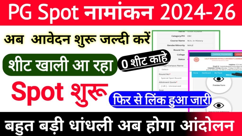 ललित नारायण मिथिला यूनिवर्सिटी के द्वारा पीजी ऐडमिशन के लिए अंतिम रूप से अवसर दिया गया है, जिसके तहत PG Spot Admission नामांकन की प्रक्रिया शुरू हो रहा है| जिसके लिए ऑनलाइन आवेदन करने की तिथि 30 दिसंबर रखा गया है ,और 31 दिसंबर यानी 2 दिन का मौका दिया गया है, जो भी इच्छुक छात्र हैं| नामांकन लेना चाहता है|