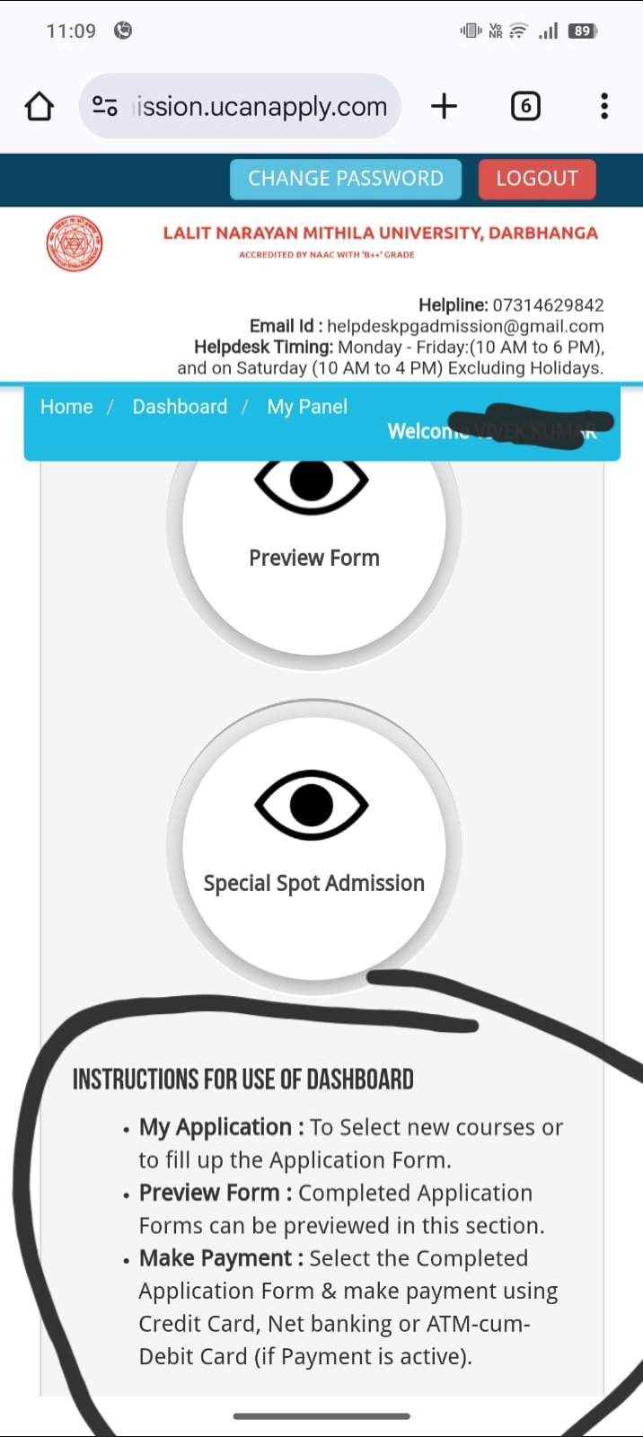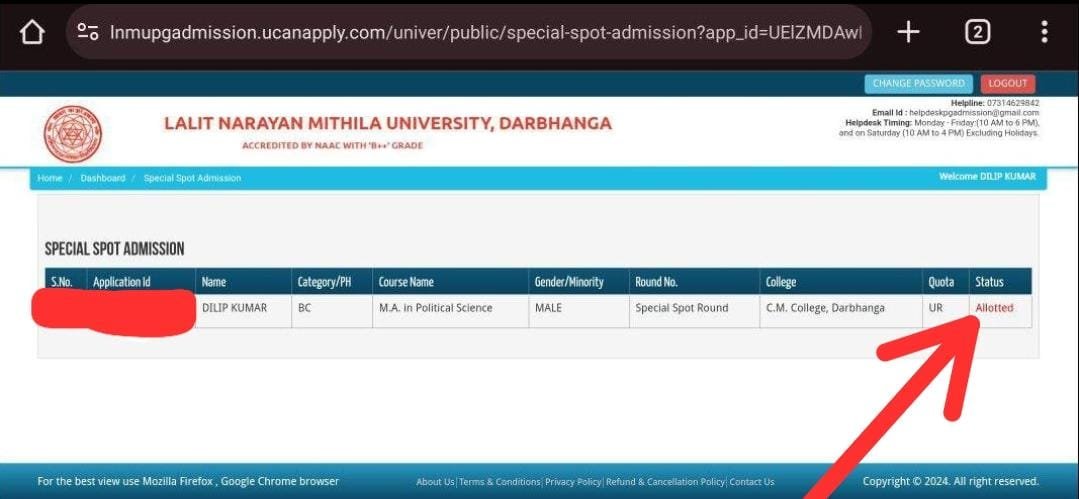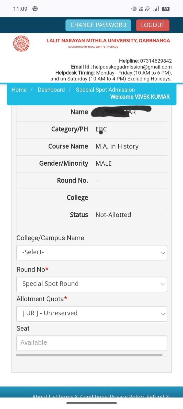 आवेदित अनामांकित छात्र/छात्रा विश्वविद्यालय के नामांकन पोर्टल पर दिनांक – 30.12.2024 से 31.12.2024 तक रिवत बच्चे सीटों के विरूद्ध अपना यूजर आईडी एवं पासवर्ड (User I.D and password) के द्वारा लॉग-इन (login) कर स्नातकोत्तर विभाग / महाविद्यालय का चयन कर सकते हैं। स्पॉट राउण्ड नामांकन पोर्टल दिनांक 30.12.2024 पूर्वाहन 11:00 बजे से सक्रिय (Active) होगा। ऑनलाईन ऑन-स्पॉट के तहत् चयनित छात्र/छात्राओं का चयन सूची दिनांक 02.01.2025 को विश्वविद्यालय के वेबसाईट पर जारी की जायेगी। छात्र/छात्रा अपना चयन-पत्र (Selection letter) डाउनलोड कर दिनांक:- 03.01.2025 से 04.01.2025 तक आवंटित विभाग / गहाविद्यालय में अपना नामांकन ले सकते हैं।