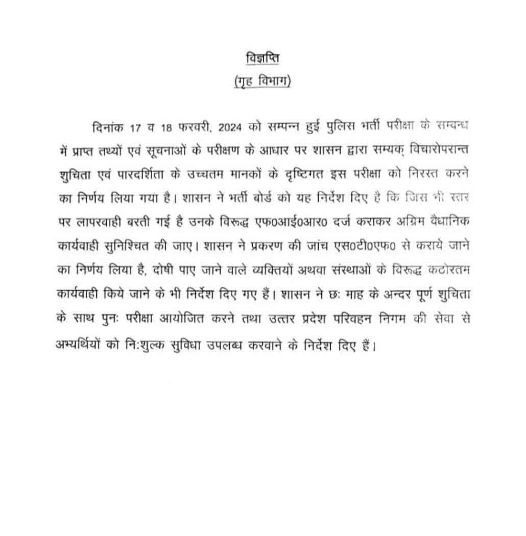 क्या सचमुच उत्तर प्रदेश पुलिस भर्ती परीक्षा रद्द कर दी गई है। या नहीं की गई है ।इसके संबंध में ऑफिशल नोटिस क्या बताता है? आपको इस पोस्ट में जानकारी दी जाएगी। अगर आप भी up पुलिस के परीक्षार्थी है। यदि उम्मीदवार है। तो आप इस पोस्ट को पूरा अवश्य पढ़े। इस पोस्ट के माध्यम से आपको बिल्कुल सही जानकारी दी जाएगी ।